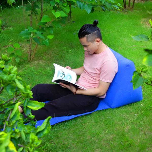 Надуваемият плажен шезлонг е идеален за облягане и отпускане, докато се наслаждавате на морския пейзаж.