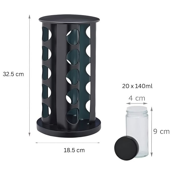 📦 Пакетът включва: 1x Стойка за подправки, 20x Стъклени буркани с херметически затворени черни капаци