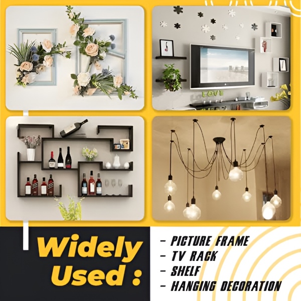 Идеален за различни нужди в домашния интериор, включително окачване на рамки за снимки, лампи, завеси, часовници, растения и други върху гипсокартон или гипсови плоскости.