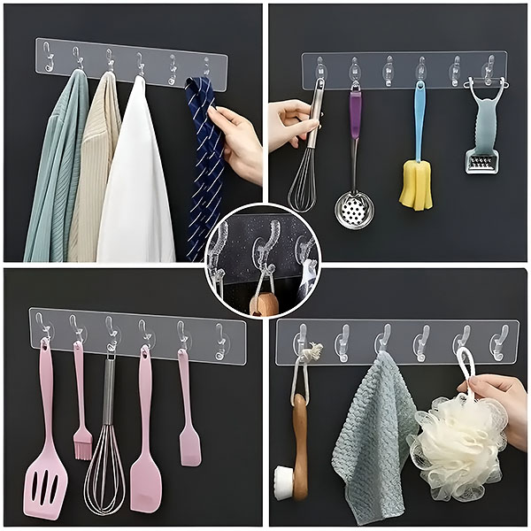 Преобразете организацията на дома си с тази гъвкава самозалепваща се закачалка. С шест здрави куки тя е идеална за поставяне на кухненски инструменти, аксесоари за баня, дрехи и др.